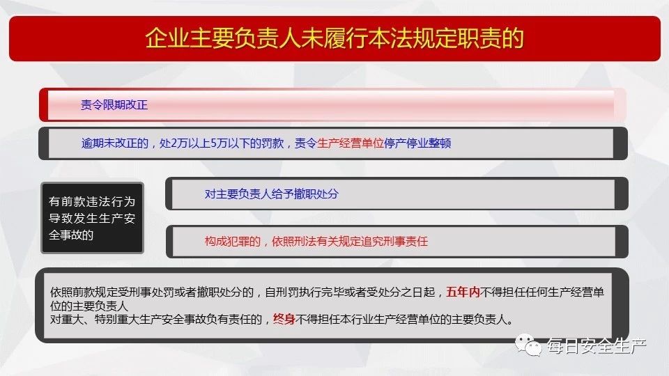 組織機(jī)構(gòu)和職責(zé) | 主要負(fù)責(zé)人未履行安全生產(chǎn)管理職責(zé)的 | 責(zé)令限期改正 | 對主要負(fù)責(zé)人處二萬元以上五萬元以下的罰款,責(zé)令生產(chǎn)經(jīng)營單位停產(chǎn)停業(yè)整頓。 |